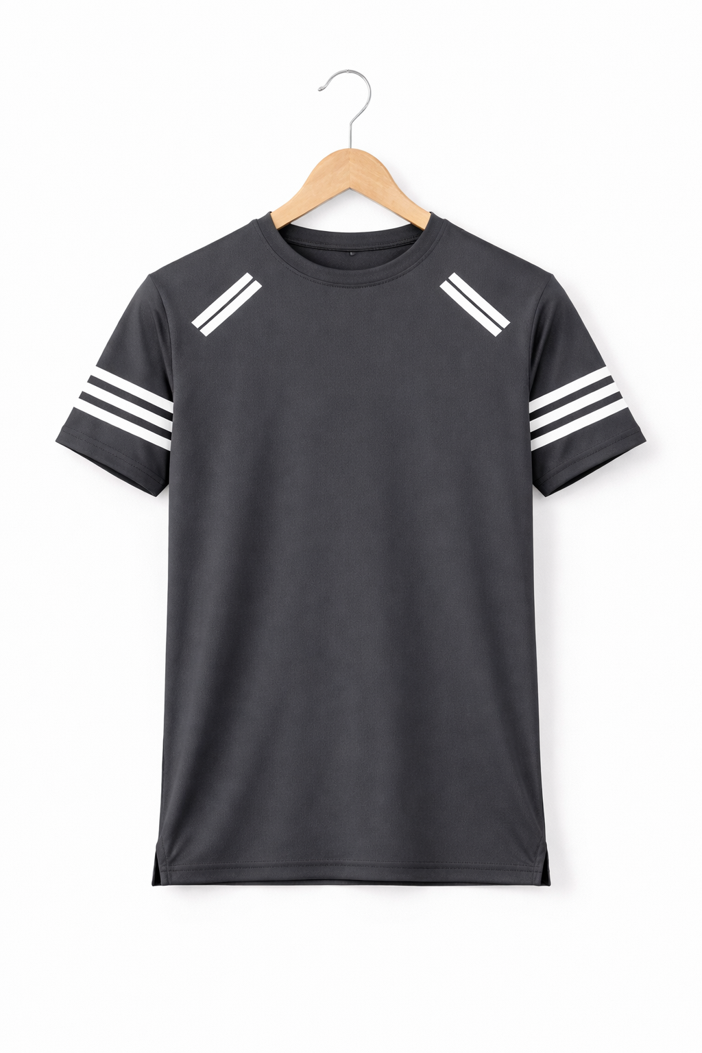 Available in four versatile colors — Classic Black, White with Black Stripes, Charcoal Grey with White Stripes, and Dark Graphite Grey, these t-shirts combine modern simplicity with sporty style for a clean and confident look.